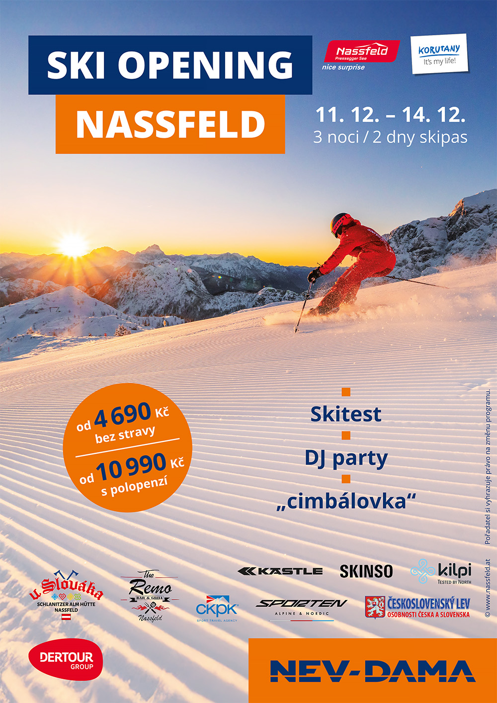 Vyrazte s námi v prosinci na oficiální zahájení zimní sezóny do oblíbeného rakouského střediska Nassfeld na již tradiční akci Ski Opening. Kromě zimních radovánek se můžete těšit na cimbálovku, testování lyží značek Sporten a Kästle, DJ párty a bohatou tombolu. Zábava zaručena!