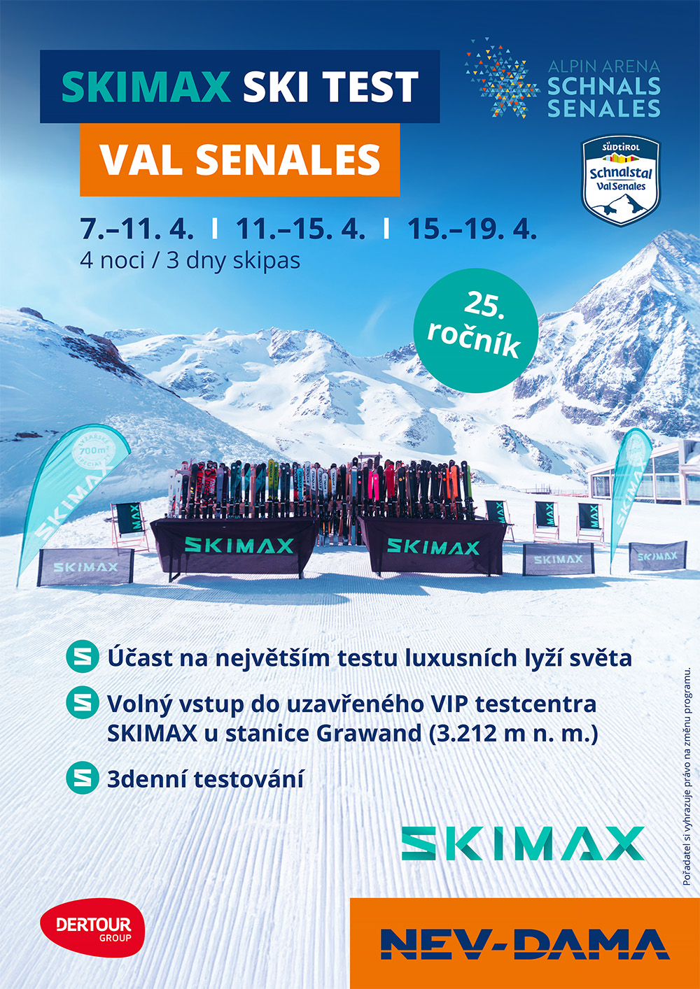 Pojeďte s námi v dubnu na velkolepou akci SKIMAX SKITEST v italském Val Senales. Čeká vás největší česko-slovenský VIP skitest nejluxusnějších značek se stovkami pánských i dámských modelů k otestování včetně kousků, o kterých jiní jen tiše sní. Ať už vybíráte nové lyže, patříte mezi nadšené „fajnšmekry“ nebo si jen chcete užít skvělou jarní lyžovačku, tahle akce je přesně pro vás.