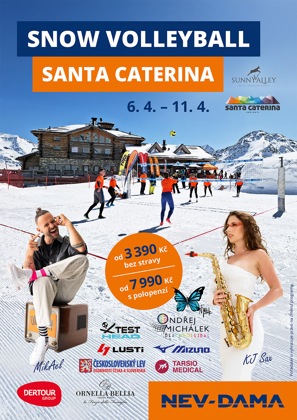 Už pošesté pro vás pořádáme mezinárodní turnaj ve snow volleyballu. Přihlaste se a užijte si volejbal na sněhu ve výšce 2 700 metrů nad mořem u krásného resortu Sunny Valley v italském středisku Santa Caterina. Můžete se těšit na koncert saxofonistky KJ Sax a zpěváka MikAela, dále na Evu Čížkovskou a Jana Šťastného.