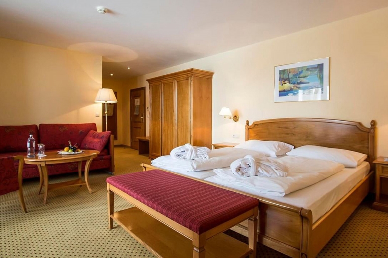 Junior Suite Deluxe 2+2 - 47 m² - ložnice s manželskou postelí, obývací pokoj s rozkládacím gaučem až pro 2 děti do nedovršených 18 let, sociální zařízení se sprchou či vanou, balkon; pokoje jsou v nové budově propojené s hlavní budovou výtahem; minimální obsazenost 2 dospělé osoby a 1 dítě; nelze infant nad maximální obsazenost pokoje